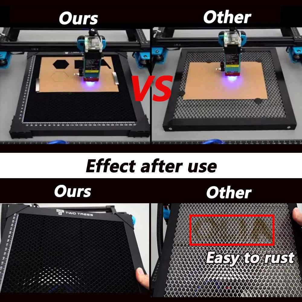 Das Wabengitter für einen optimalen Luftstrom beim Schneiden. Es hilft, die Temperatur des geschnittenen Stücks und der schnellen Kühlung zu kontrollieren. Dadurch wird das Rauchen, Ruß oder Verziehen des Stücks, an dem Sie arbeiten, verringern. Es reduziert Rauch und Verkohlung auf der Rückseite des Stücks beim Schneiden wirklich eine bessere Verarbeitungsqualität.